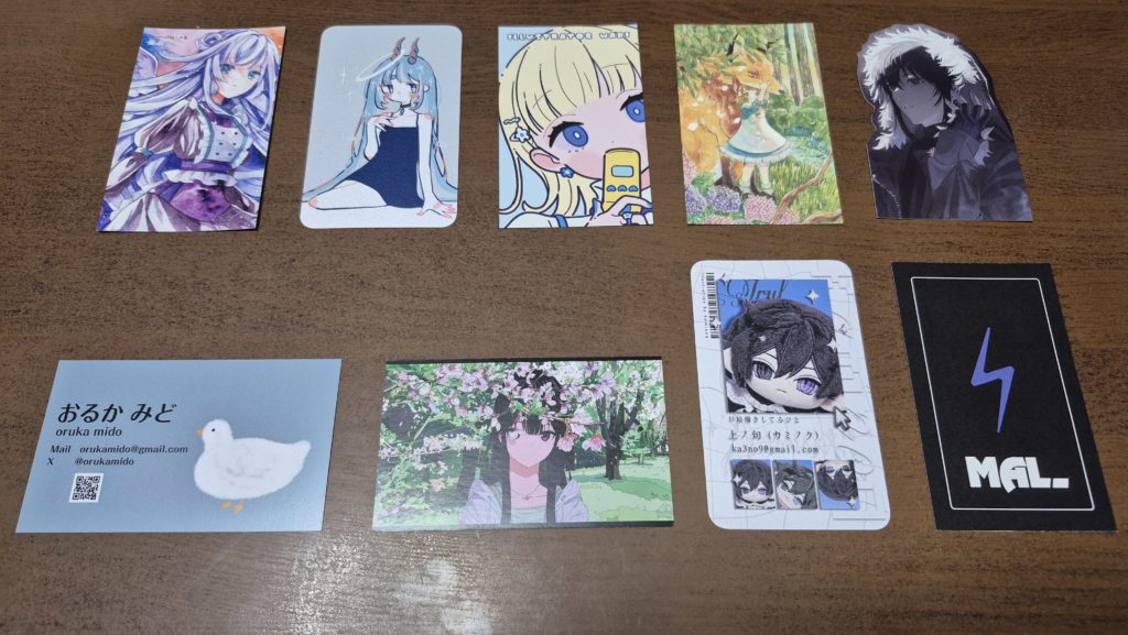 そして、会場でブースを構えているクリエイターさんのブースを一通り回りました。各クリエイターさんが自身の自己紹介のカード(名刺? 取りあえず、以下自己紹介カードとします)を置かれていて、それを頂くのでもちょっとテンション上がりますね。